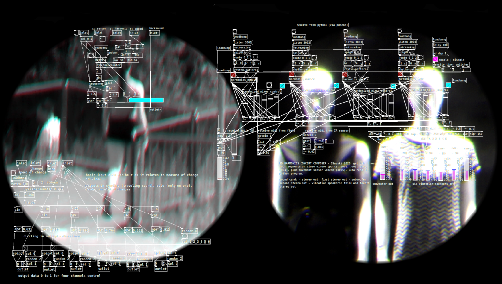 Arhitektonsko izhodišče je prostor, ki je “ovit” v videoprojekcije, znotraj prostora pa je zvočno polje, ki prehaja med različnimi oblikami harmonije/ disharmonije. Predvajani videi poganjajo dinamiko generiranih zvokov, ki privzamejo naravo subtilnih zvočnih resonanc. Dodatni vir dinamike je senzor, ki zazna gibanje v prostoru in sodeluje pri zvočnih spremembah. Štiri kanalna video-projekcija in šest kanalni zvok.