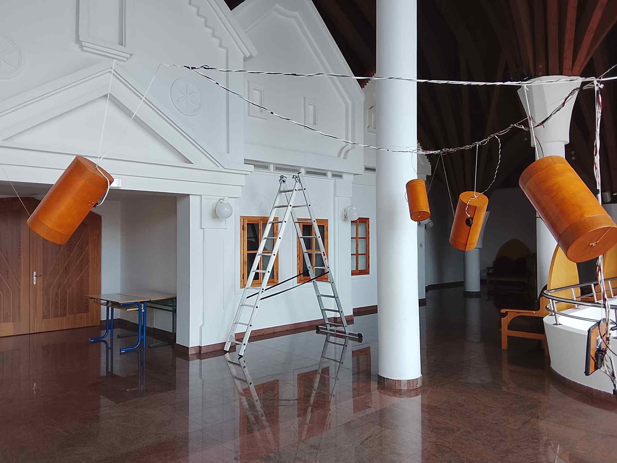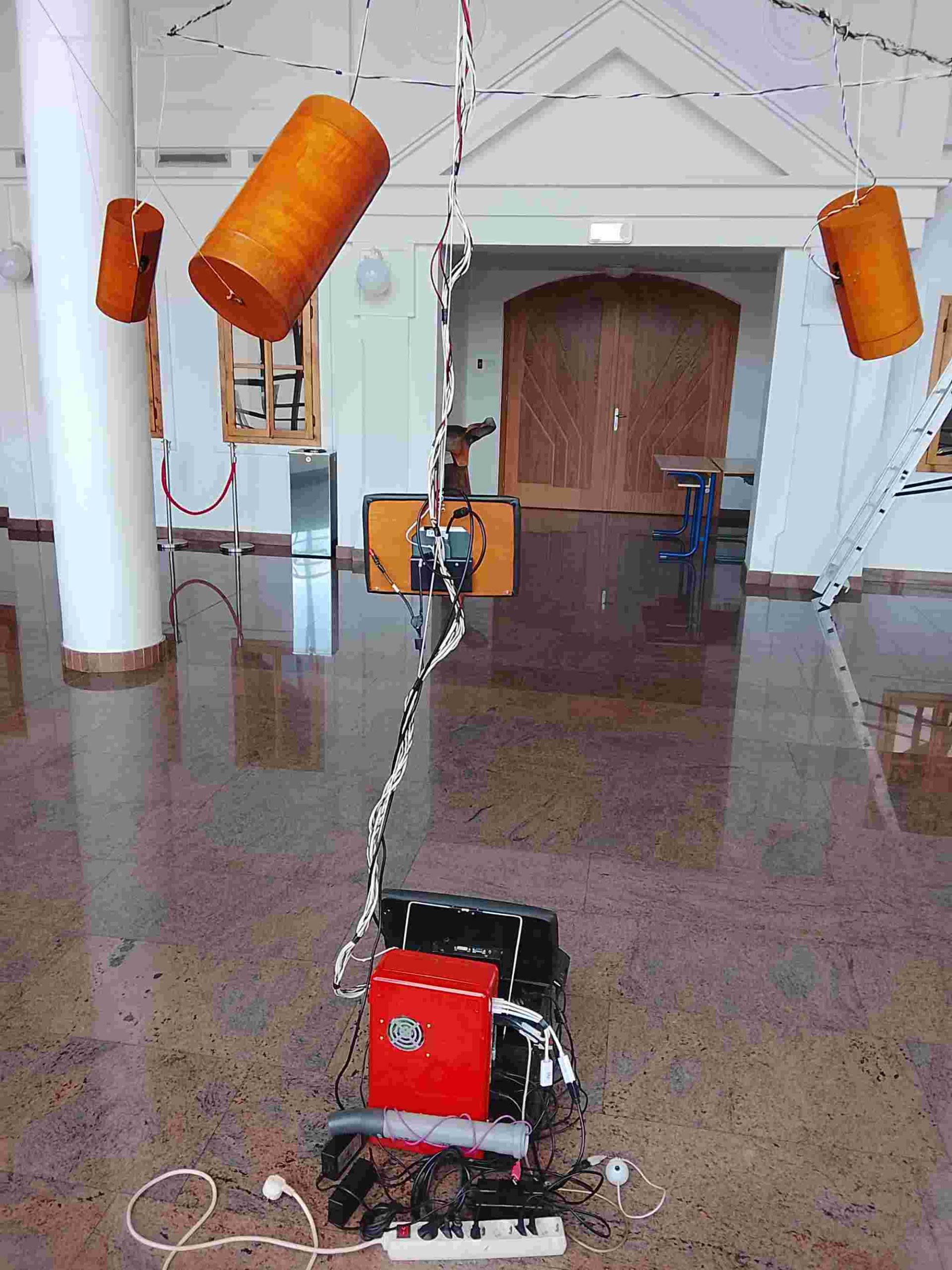 Šest lesenih resonančnih teles (zvočil) razmaknjeno razobešenih pod stropom, s snopom električnih žic povezanih z računalnikom in nizkotonskim zvočnikom. Sredi vertikalnega snopa oko, ki motri neposredno okolico in predlaga spremembe zvočnemu algoritmu/ umetnemu organizmu. Oko seveda potrebuje kamerico, ker umetno oko ne vidi – je le podoba. Podobno je z drevesom – vertikalno razporejena struktura, zgoraj v navidezno krošnjo zvočil, spodaj s težjimi elementi in dovodom elektrike – kvečjemu spominja na drevo. Vendarle, drevo je eden od osnovnih arhetipov, ki vsebuje širše pomene: položaj človeka (drevo je večje), človeško minljivost (drevo živi dlje), zavetje in podobno. Zato se v zvezi z drevesom v človeški domišljiji lahko pojavi tudi podoba očeta. In božjega očesa.